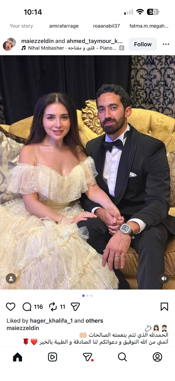أعلنت الفنانة مي عز الدين زواجها رسميًا، حيث شاركت جمهورها صورة من حفل الزفاف عبر حسابها على موقع إنستجرام، وكتبت تعليقًا مقتضبًا قالت فيه: الحمد لله الذي تتم بنعمته الصالحات، أتمنى من الله التوفيق ودعواتكم لنا الصادقة والطيبة بالخير.
