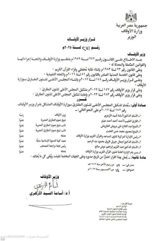 أصدر الدكتور أسامة الأزهري وزير الأوقاف قرارًا بإعادة تشكيل المجلس الأعلى لشؤون المقارئ بوزارة الأوقاف، حيث تم تعيين القارئ الطبيب أحمد نعينع شيخًا لعموم المقارئ المصرية، والشيخ عبد الفتاح الطاروطي نائبًا لشيخ عموم المقارئ، فيما يتولى وزير الأوقاف رئاسة المجلس.