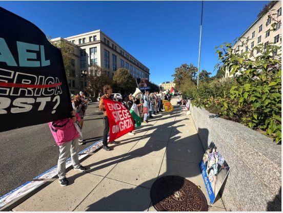 نشطاء «أسطول الصمود» يتظاهرون أمام الخارجية الأمريكية لفضح الانتهاكات الإسرائيلية