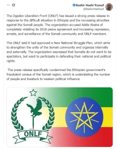 وفي تطور لافت، أعلنت جبهة تحرير أوجادين رفضها لـ”التعداد السكاني المزور” الذي نفّذته الحكومة الإثيوبية في الإقليم، متهمة السلطات بـخفض الأرقام عمدًا — سواء الخاصة بالسكان أو الثروة الحيوانية — بهدف إضعاف النفوذ السياسي للصوماليين وتغيير الحقائق الديموجرافية لصالح الحكومة المركزية.