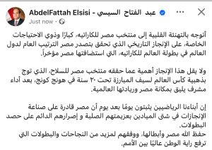 وكتب الرئيس السيسي عبر حساباته الرسمية على مواقع التواصل الاجتماعي: “أتوجه بالتهنئة القلبية إلى منتخب مصر للكاراتيه، كبارًا وذوي الاحتياجات الخاصة، على الإنجاز التاريخي الذي تحقق بتصدر مصر الترتيب العام لدول العالم في بطولة العالم للكاراتيه، التي استضافتها مصر مؤخراً”.