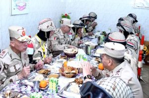 وشارك الفريق أحمد خليفة المقاتلين داخل إحدى النقاط الحدودية تناول وجبة الغداء ، كما قام بالتفقد جواً لعدد من نقاط التأمين الحدودية المتمركزة بنطاق مسئولية المنطقة الغربية العسكرية .