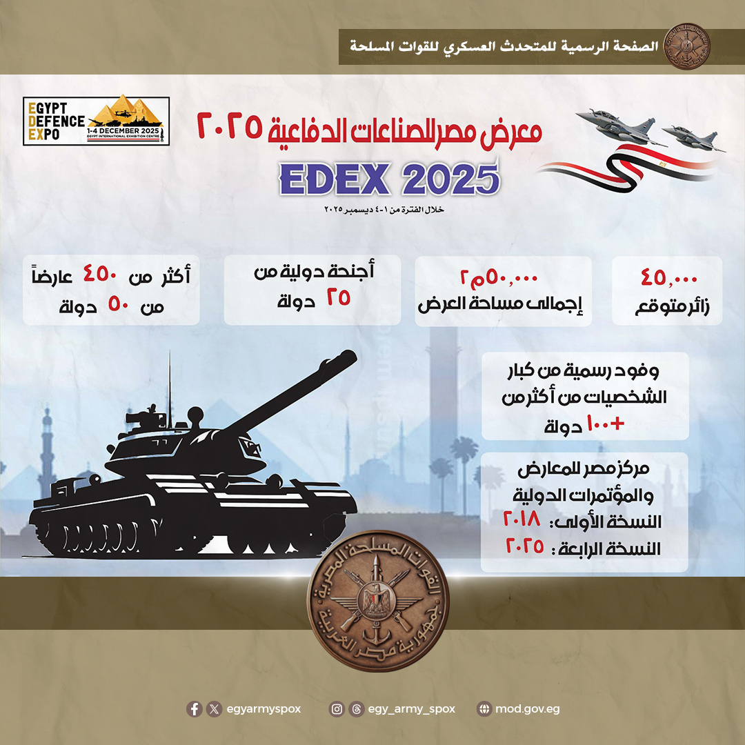 القوات المسلحة تعلن انطلاق معرض إيديكس 2025 أول ديسمبر بمشاركة عالمية واسعة