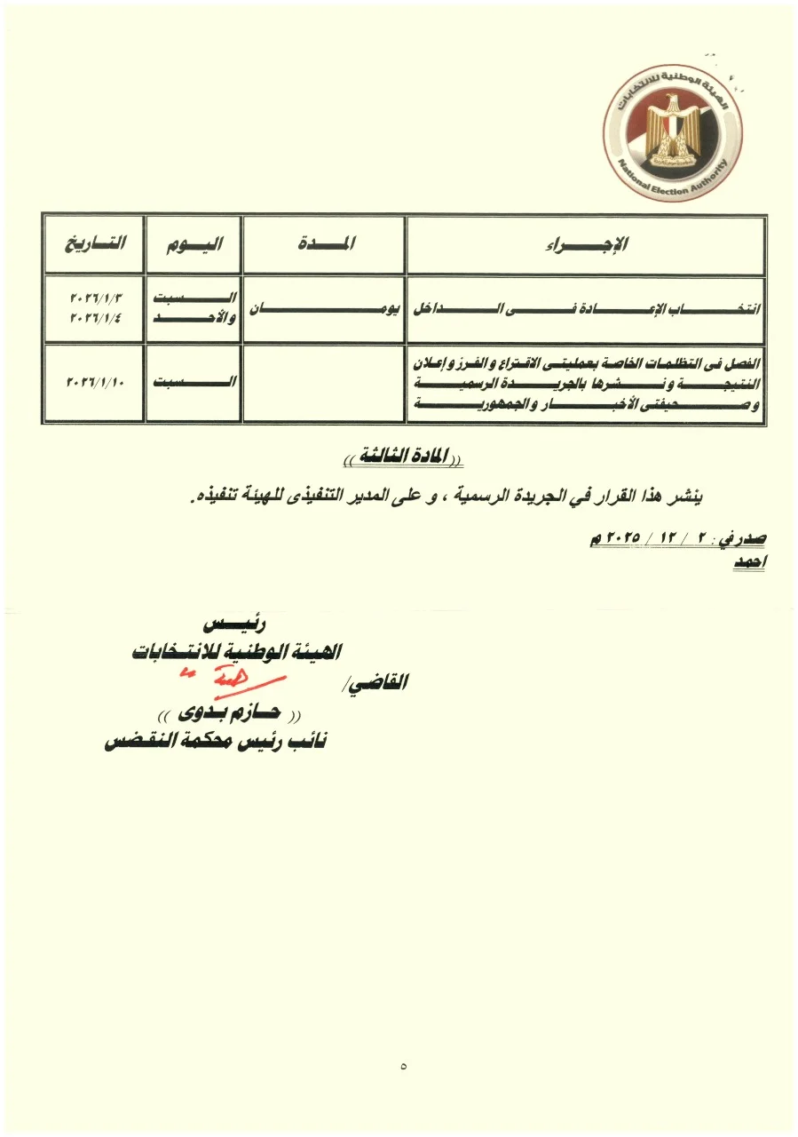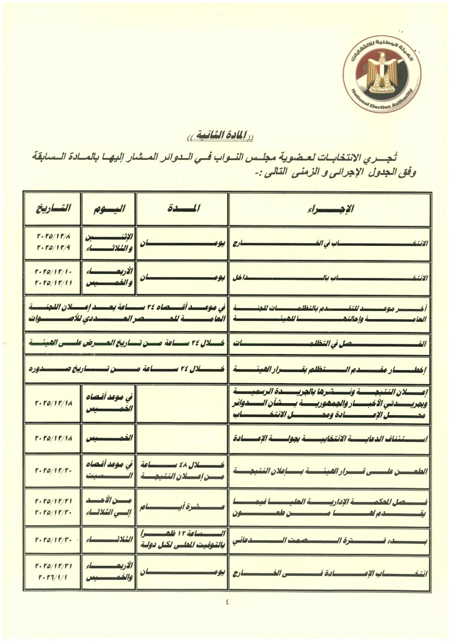 أعلنت الهيئة الوطنية للانتخابات برئاسة القاضي حازم بدوي الجدول الزمني للإجراءات الانتخابية الخاصة بالدوائر التي تم إلغاء نتائجها بقرار صادر من محكمة القضاء الإداري، حيث تم الكشف عن تفاصيل المواعيد المحددة لإعادة العملية الانتخابية في هذه الدوائر تنفيذا لحكم المحكمة الإدارية العليا.