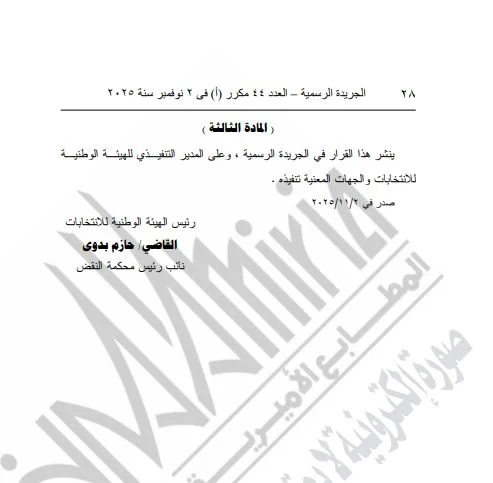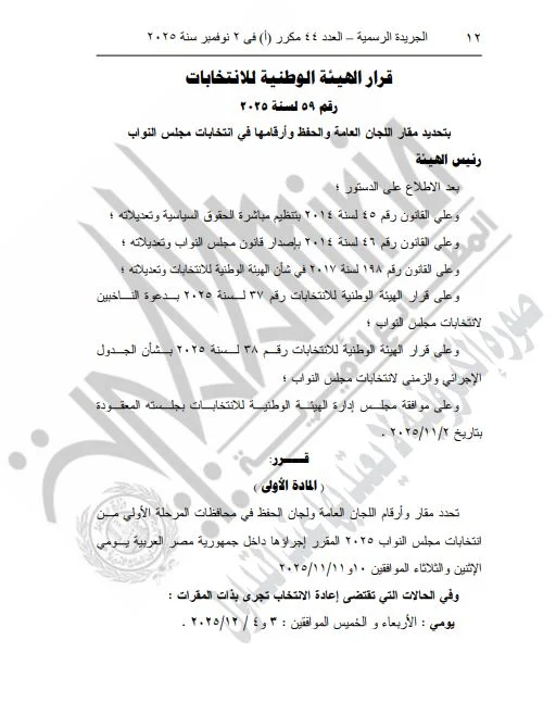 أصدرت الهيئة الوطنية للانتخابات برئاسة القاضي حازم بدوي القرار رقم 59 لسنة 2025 بشأن تحديد مقار اللجان العامة ولجان الحفظ وأرقامها في انتخابات مجلس النواب.