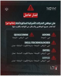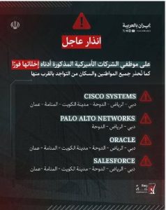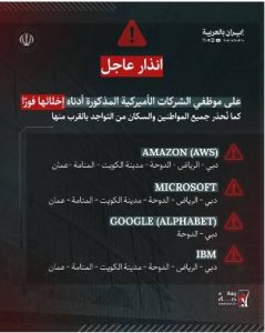 وتضمن بيان الحرس الثوري قائمة تضم 29 موقعًا لشركات تكنولوجيا أمريكية في منطقة الخليج العربي، شملت جوجل؛ حيث تم تحديد أربعة منشآت تابعة لها في المنطقة، ومايكروسوفت بخمسة مواقع، ومنشآت وآي بي إم بستة منشآت؛ بالاضافة إلى بالانتير التي استهدفت ثلاثة من مكاتبها أو مراكز بياناتها، وأوراكل وإنفيديا بثلاثة مواقع لكل منهما ضمن بنك الأهداف الإيراني.