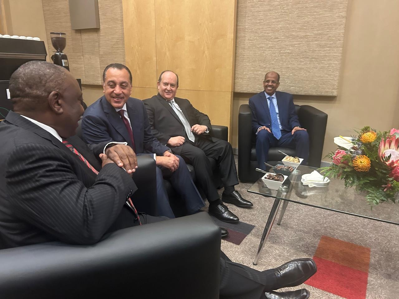 وعند وصول رئيس مجلس الوزراء إلى مقر انعقاد العشاء بمركز ساندتون للمؤتمرات بقلب مدينة جوهانسبرج، التقى الرئيس سيريل رامافوزا، حيث نقل الدكتور مصطفى مدبولي تحيات الرئيس عبد الفتاح السيسي إلى الرئيس الجنوب إفريقي، معربا عن تقدير مصر للرئاسة الجنوب إفريقية لمجموعة العشرين، وتوجيه الدعوة لمصر للمشاركة كدولة ضيف في اجتماعات المجموعة لهذا العام. وأكد رئيس الوزراء دعم مصر لأولويات الرئاسة الجنوب أفريقية، مشيداً بقيادة جنوب أفريقيا في تسيير أعمال المجموعة وتعزيز مصالح إفريقيا.