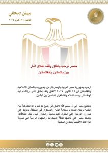 وأكدت وزارة الخارجية والهجرة وشئون المصريين بالخارج في بيان رسمي، أن القاهرة تتطلع لأن يسهم هذا الاتفاق في حقن الدماء ووضع حد للتصعيد العسكري، بما يعزز من استدامة الأمن والاستقرار الإقليمي في جنوب آسيا.