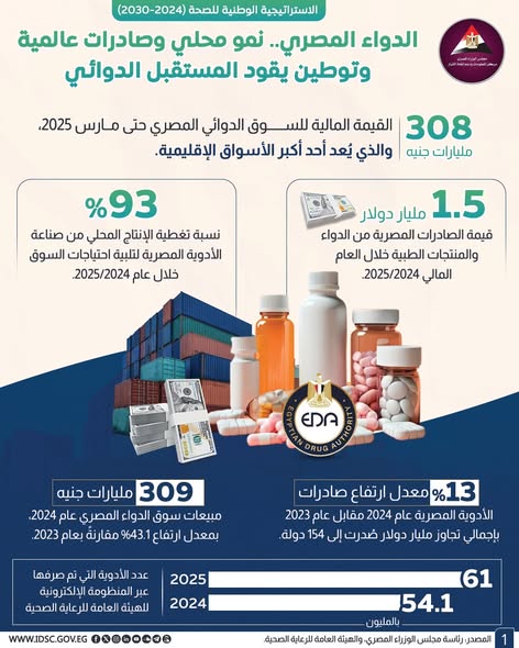 أوضح مركز المعلومات ودعم اتخاذ القرار بمجلس الوزراء أن صناعة الدواء المصرية تُعد من أكبر وأهم الصناعات في منطقة الشرق الأوسط وإفريقيا، نظرًا لما تمتلكه من بنية إنتاجية قوية وخبرة طويلة في هذا المجال.