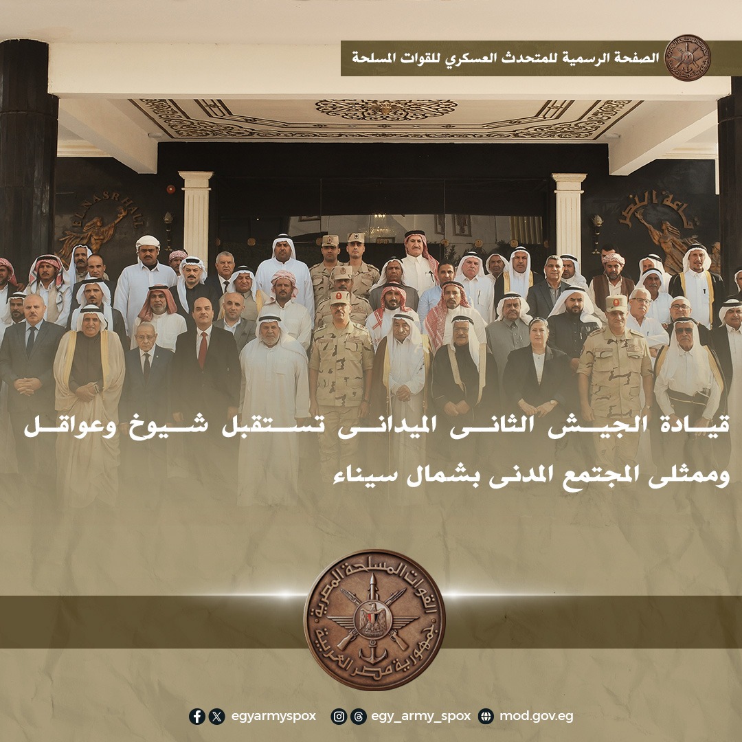 استقبلت قيادة الجيش الثانى الميدانى عددا من شيوخ وعواقل وممثلى المجتمع المدنى بمحافظة شمال سيناء.