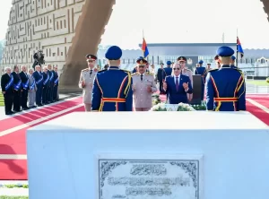 وضع الرئيس إكليل الزهور على قبر الجندي المجهول، فيما عزفت الموسيقى العسكرية “سلام الشهيد” تخليدًا لأرواح الشهداء.