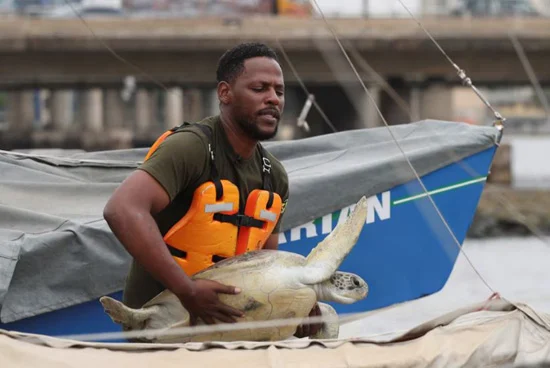 ونشرت وكالة رويترز صورًا توثق عمليات إنقاذ السلاحف المصابة وتنظيف الشواطئ من النفايات البلاستيكية.