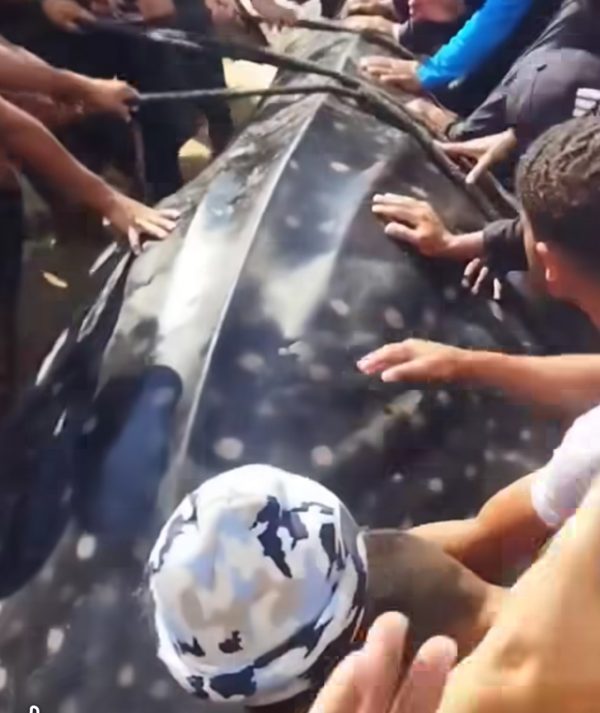 ظهور نادر لقرش حوتي عملاق على شاطئ خان يونس يبهج نازحي غزة
