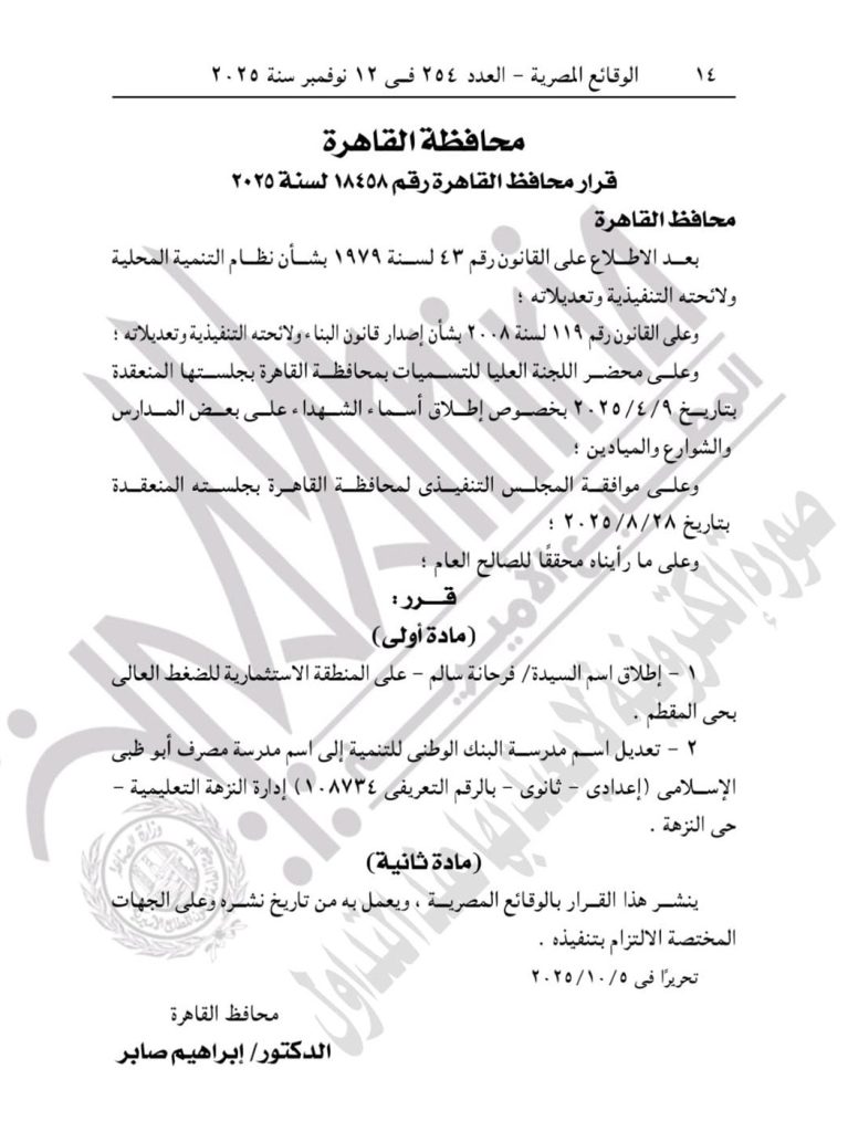 إطلاق اسم فرحانة سالم على المنطقة الاستثمارية للضغط العالي بحي المقطم، مع تعديل اسم مدرسة البنك الوطني للتنمية ليصبح مدرسة مصرف أبو ظبي الإسلامي (إعدادي – ثانوي) تحت الرقم التعريفي 108734، والتابعة لإدارة النزهة التعليمية بحي النزهة.
