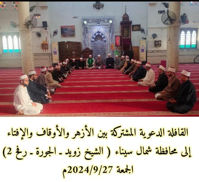 تنطلق اليوم الجمعة قافلة دعوية مشتركة تضم علماء من الأزهر الشريف ووزارة الأوقاف ودار الإفتاء المصرية إلى عدد من مساجد محافظة شمال سيناء.