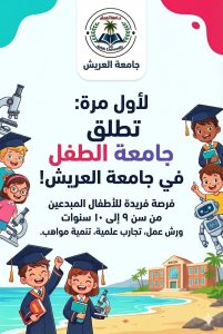 وتؤكد جامعة العريش أن إدراجها في مبادرة جامعة الطفل يفتح آفاقًا جديدة للأطفال، ويعزز من ثقافة العلم والابتكار في المجتمع، مواصلة جهودها في دعم التعليم النوعي وتنمية الموارد البشرية منذ المراحل العمرية المبكرة.
