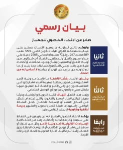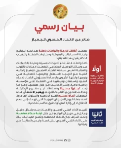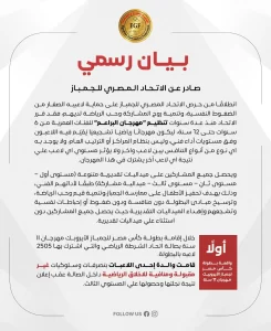 وفي ختام البيان، دعا الاتحاد جميع أولياء الأمور والمدربين إلى الالتزام بطرق الاعتراض الرسمية المنصوص عليها في اللوائح، مؤكدًا أنه يعمل في إطار من الشفافية والنزاهة ويهدف إلى تربية جيل من الرياضيين الصغار يؤمنون بالروح الرياضية والاحترام والمسؤولية، وأنه لن يتهاون في مواجهة أي إساءة تمس أبناء اللعبة أو قيم الرياضة المصرية.