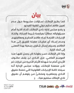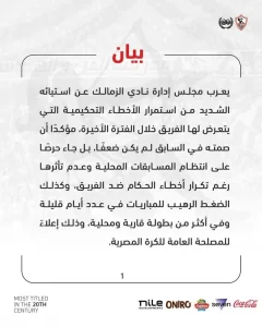 مجلس إدارة النادي أكد في بيانه أن حالة الهدوء التي سبقت هذا التحرك لم تكن “ضعفاً”، بل كانت تغليباً لمصلحة الكرة المصرية، إلا أن أحداث مباراة سيراميكا كليوباترا في كأس مصر كانت “القشة التي قصمت ظهر البعير”.