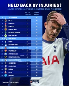 كشف تقرير حديث لموقع ترانسفير ماركت المتخصص في إحصائيات وأسعار اللاعبين، عن أبرز الأندية الأوروبية التي تأثرت بغياب لاعبيها بسبب الإصابات منذ بداية الموسم، حيث تصدر توتنهام هوتسبير القائمة.