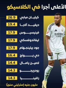 وبحسب التقرير، يتقاضى مبابي راتبًا أسبوعيًا يبلغ نحو 600,962 يورو، أي ما يعادل 31.25 مليون يورو سنويًا، ليصبح الأعلى أجرًا في تاريخ مواجهات الكلاسيكو الحديثة.