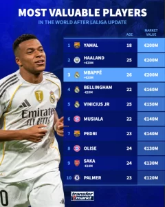 وشهدت القيمة التسويقية لمبابي قفزة جديدة بلغت 20 مليون يورو، ليعود إلى حاجز الـ200 مليون للمرة الأولى منذ عام 2019، في انعكاس مباشر لمستواه الاستثنائي مع ريال مدريد هذا الموسم، حيث سجل 26 هدفًا خلال 24 مباراة في مختلف البطولات، مؤكدًا أنه الصفقة الأهم في الكرة العالمية حاليًا.