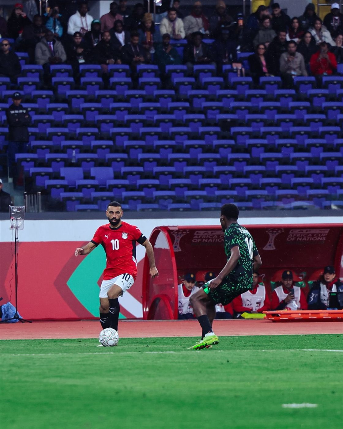 وشهدت الدقيقة 36 تسجيل أكون أدمز هدفًا لمنتخب نيجيريا برأسية، غير أن الحكم المغربي جلال جيد ألغى الهدف بداعي ارتكاب مهاجم نيجيريا مخالفة باستخدام الكوع ضد حمدي فتحي، لينتهي الشوط الأول بالتعادل السلبي.