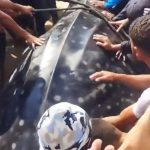 ظهور نادر لقرش حوتي عملاق على شاطئ خان يونس يبهج نازحي غزة