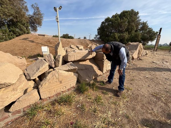 كتل حجرية منقوشة تمثل واجهة الصرح الأول، والتي خضعت لعمليات التوثيق والتسجيل.