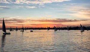 مع اقتراب الشمس من الأفق، تتحول مياه النيل إلى لوحة زيتية بألوان برتقالية وذهبية، وهو “الموعد المقدس” الذي يتسابق فيه السائحون لاستقلال المراكب الشراعية.