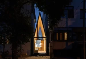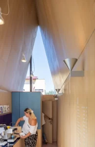 في الداخل، تُعطي الإضاءة الطبيعية والسقف العالي إحساسًا بالرحابة رغم المساحة المحدودة، فيما أضاف استخدام الخشب الدافئ لمسة من الراحة والسكينة.