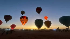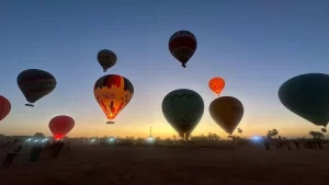 وهناك، في مطار البالون الطائر، يبدأ مشهد الإقلاع المذهل: العشرات من البالونات العملاقة تُجهّز وسط أنوار الصباح الأولى، لتتحول السماء إلى لوحة فنية من الألوان والحركة.