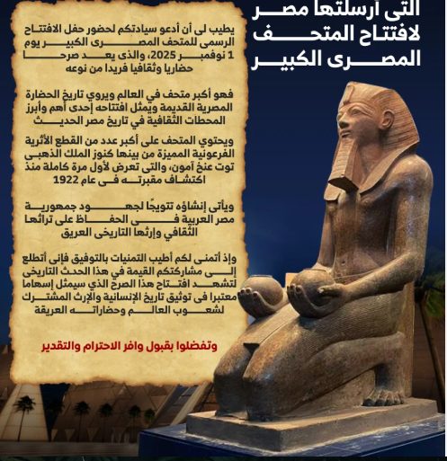 «يطيب لي أن أدعو سيادتكم لحضور حفل الافتتاح الرسمي للمتحف المصري الكبير يوم 1 نوفمبر 2025، والذي يعد صرحًا حضاريًا وثقافيًا فريدًا من نوعه؛ فهو أكبر متحف في العالم، ويروي تاريخ الحضارة المصرية القديمة، ويمثل افتتاحه إحدى أهم وأبرز المحطات الثقافية في تاريخ مصر الحديث، ويحتوي المتحف على أكبر عدد من القطع الأثرية الفرعونية المميزة من بينها كنوز الملك الذهبي توت عنخ آمون، التي تُعرض لأول مرة كاملة منذ اكتشاف مقبرته عام 1922، ويأتي إنشاؤه تتويجًا لجهود جمهورية مصر العربية في الحفاظ على تراثها الثقافي وإرثها التاريخي العريق؛ وإذ أتمنى لكم أطيب التمنيات بالتوفيق؛ فإني أتطلع إلى مشاركتكم القيمة في هذا الحدث التاريخي لتشهدوا سويًا افتتاح هذا الصرح، الذي سيمثل إسهامًا معتبرًا في توثيق تاريخ الإنسانية والإرث المشترك لشعوب العالم وحضاراته العريقة.