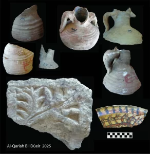 كما أسفرت الحفائر عن مجموعة متميزة من اللقى الأثرية، شملت أمفورات تخزين تحمل كتابات محتملة، وأوستراكات مدونة بالخط القبطي، إلى جانب أدوات معيشة يومية، وكِسَر حجرية لعناصر معمارية، وأجزاء من لوحات حجر جيري منقوشة بالخط القبطي.