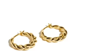 أقراط دائرية: حلقات مقببة وملتوية قليلاً، مصنوعة من الذهب ومرصعة بالفضة الإسترلينية عيار 925، مطلية بالذهب الأصفر أو الأبيض عيار 14 قيراطًا، السعر: 2,208.28 جنيه مصري.