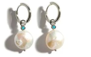 أقراط جلوريا: حلقات دائرية نسائية مرصعة بلؤلؤ وحجر فيروزي صغير، مصنوعة من الذهب المطلي بالفضة عيار 925، السعر: 1,121.03 جنيه مصري.