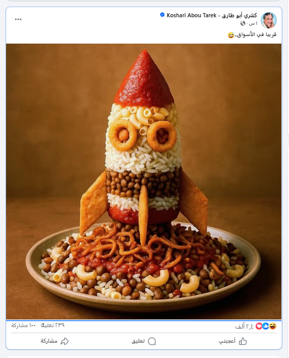 في خطوة غير مألوفة، لفت مطعم “أبو طارق” الشهير في القاهرة الأنظار بعدما نشر عبر صفحته الرسمية على فيسبوك صورة لطبق كشري جديد مصمم على هيئة صاروخ، مرفقًا بتعليق مقتضب: “قريبًا”.