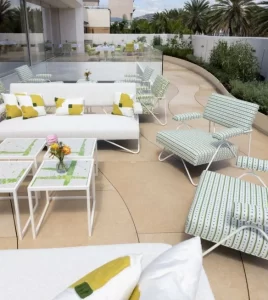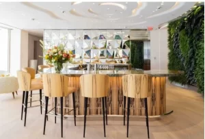 تتسع القاعة لـ 105 ضيوف، تشمل تراسًا أنيقًا وبارًا بـ11 مقعدًا. تغمره الإضاءة الطبيعية عبر نوافذ ممتدة من الأرض إلى السقف، فيما تتزين الطاولات بأوانٍ فاخرة بدرجة المشمش الفاتح المصممة خصيصًا لافتتاح المطعم.