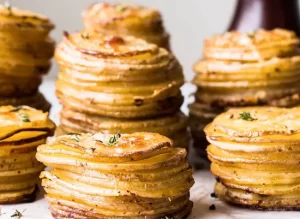 قطّعي البطاطس أسطوانياً وحمّريها بالزبدة حتى تكتسب لوناً ذهبياً.